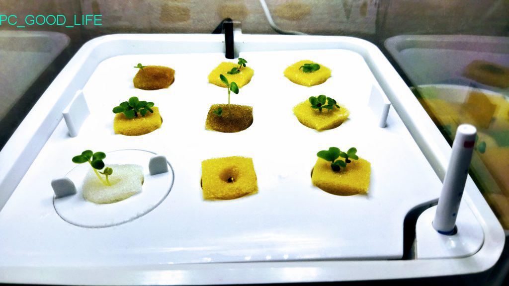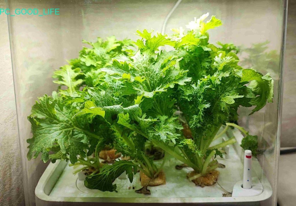 今回は水耕栽培機を使ってわさびリーフの栽培を行いました。このGreenFarmCubeはアクリルケースの中で植物を育てることができるので、葉物野菜の大敵である虫の害を防ぐことができます。また上部にLED照明とファンがありますので室内で野菜を育成できます。