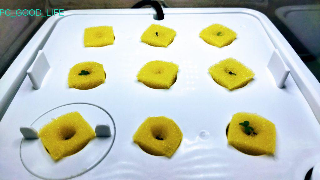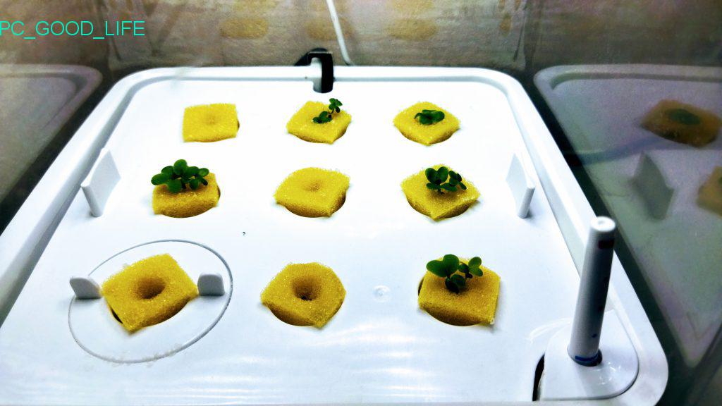 5.アクリルケースを被せて栽培の準備が終わりました。ケース内の上の方に見えるのが黒い部分がファンでその周りにLEDライトがあります。まだ照明をつけていません。