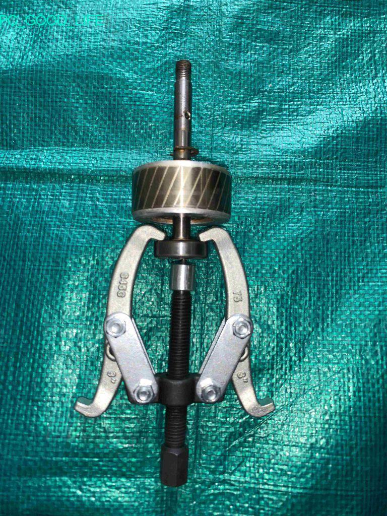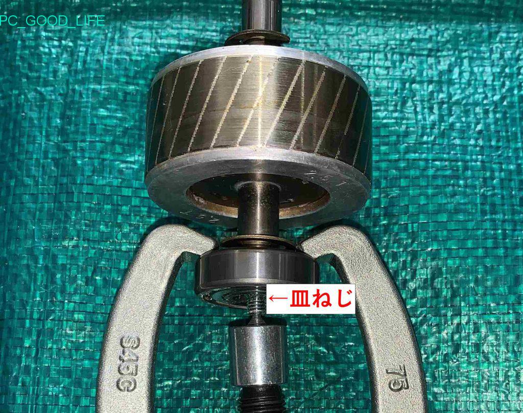 【fig.48】ローター、皿ねじ、ギアプーラーを写真のようにセットします。この状態でギアプーラーのボルトを締めていくと下側ベアリングが外れます。