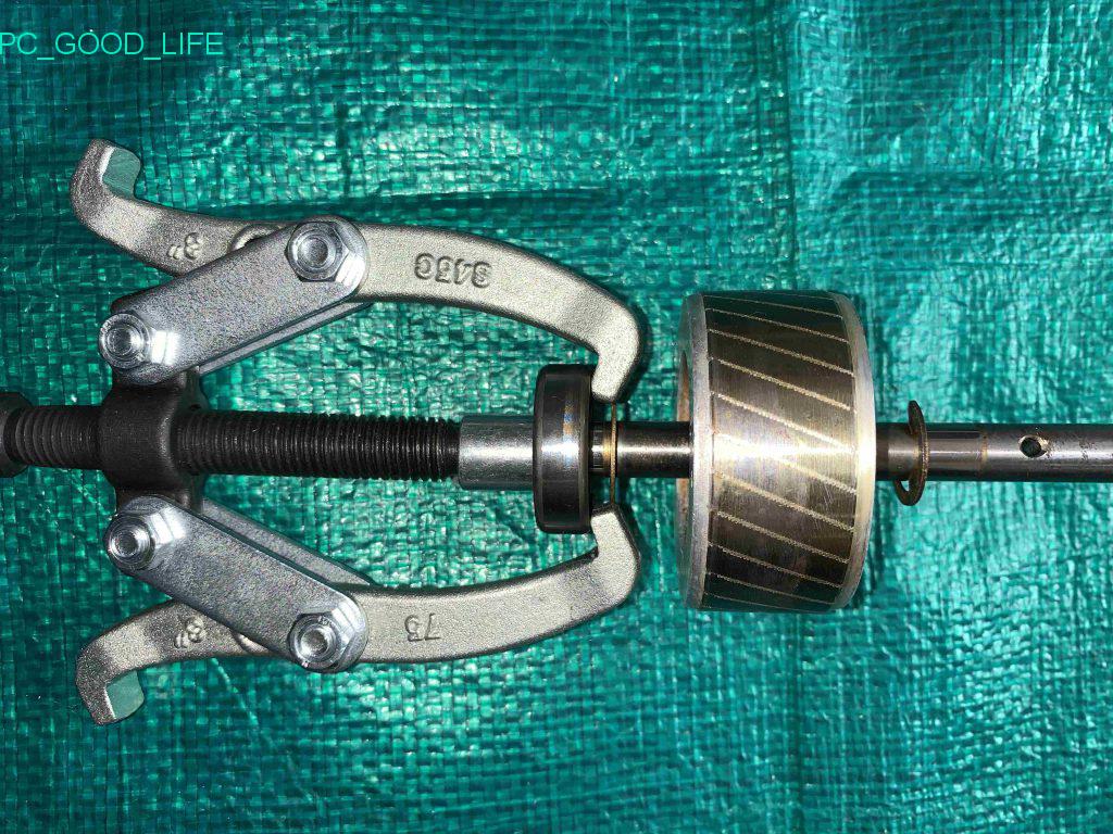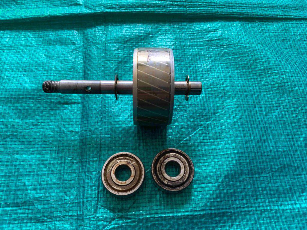 ローターの左側がシロッコファンが付いていた方でピンを抜いた穴が見えます。2つのベアリングはローターの両側にあるEリングに密着するかたちで圧入されていました。