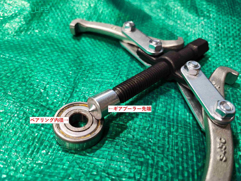 【fig.42】ベアリングは5mm位移動しています。しかしこれ以上は動かせないのです。ギアプーラーの先端がベアリングの内径より大きいのでつっかえてしまうのです。