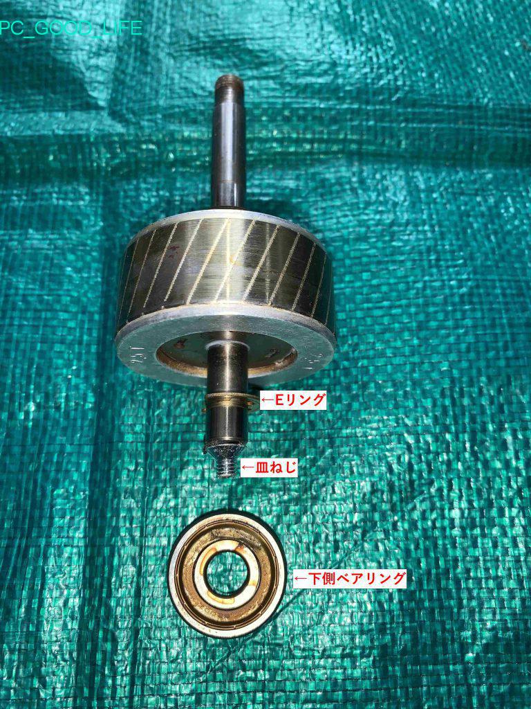 【fig.49】下側ベアリングも外せました。Eリングも良く見えています。両面テープでローターの軸に取り付けた皿ねじもこの状態の方が分かりやすいと思います。