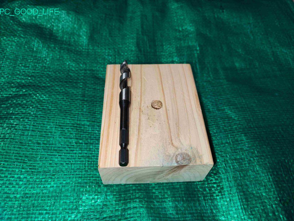 【fig.47】ヒノキ工作板にローターのピンの穴がある方を刺しています。